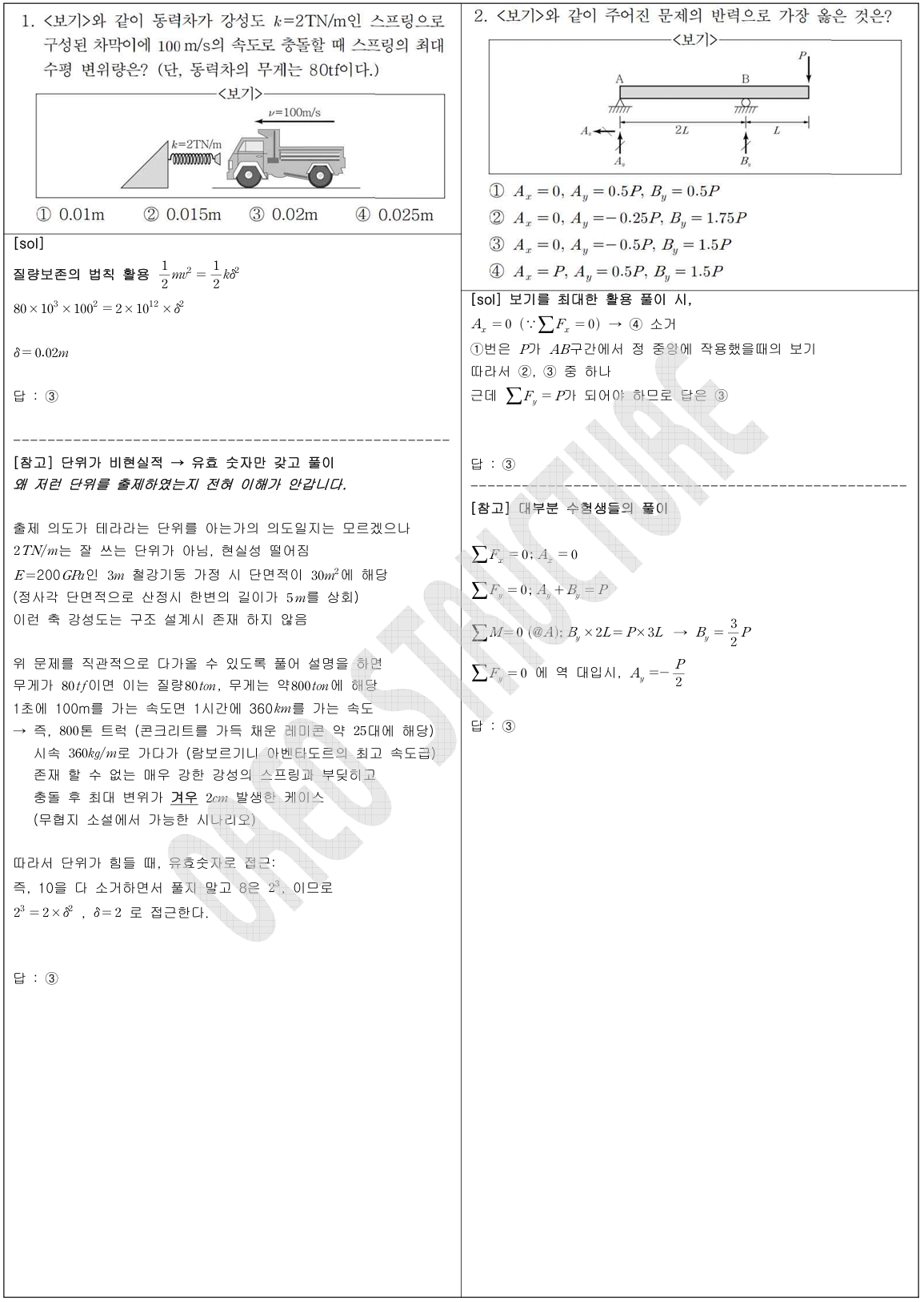 바로 풀린다” 리스트 (문제당 30초 내외)1 (모멘트 중첩법), 2 (정정 아치 평형방정식), 3 (힘의 벡터 합력), 6 (평형방정식을 통한 반력산정), 7 (모멘트 중첩), 9 (모멘트 중첩), 10 (응력과 모어원)11 (단면의 최대전단 응력), 12 (평형방정식 트러스 절점법), 14 (평형방정식 트러스 절점법)15 (BMD의 기본), 16 (평형방정식을 통한 반력 산정), 18 (단면계수와 모멘트의 관계), 19(좌굴의 기본 개념)20 (평행축정리), 21 (영향선의 기본), 22(탄성계수, 포아송비, 전단탄성계수), 23(단면의 극관성모멘트),24 (응력과 모어원)“시간이 걸리지만 풀만하다” 혹은 낯선 유형 리스트[Newbie 기준] 5 (강절점의 적합조건) : 프레임과 처짐에 공포감이 있..