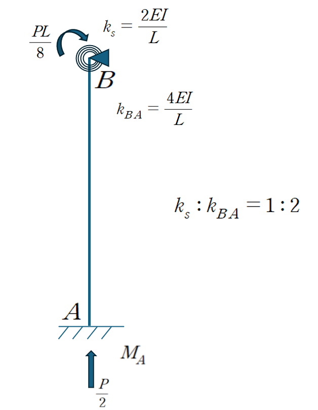 이렇게 되면 PL/8을 부재 AB와 스프링이 나눠 갖는 스프링 병렬 연결로 해석 할 수 있습니다.