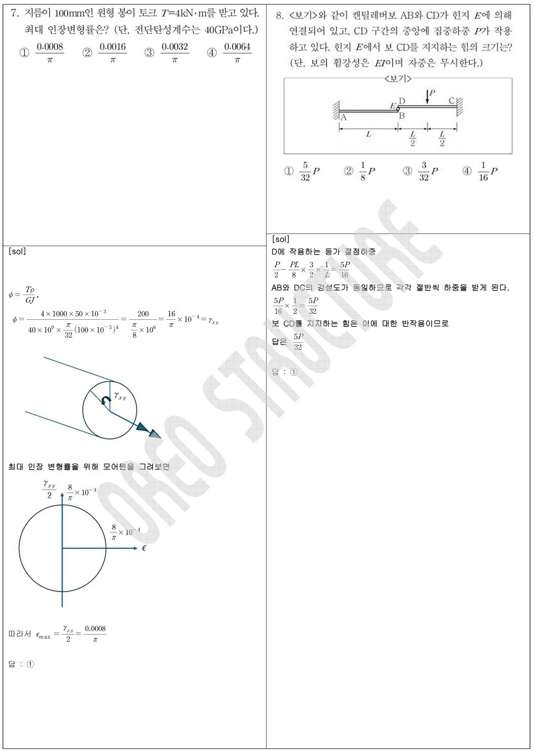 7번 문항은 비틀림–전단변형률–모어원–인장변형률을 하나의 흐름으로 연결해 주는 문제로,