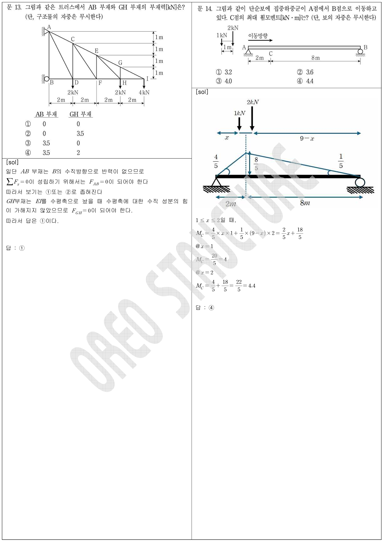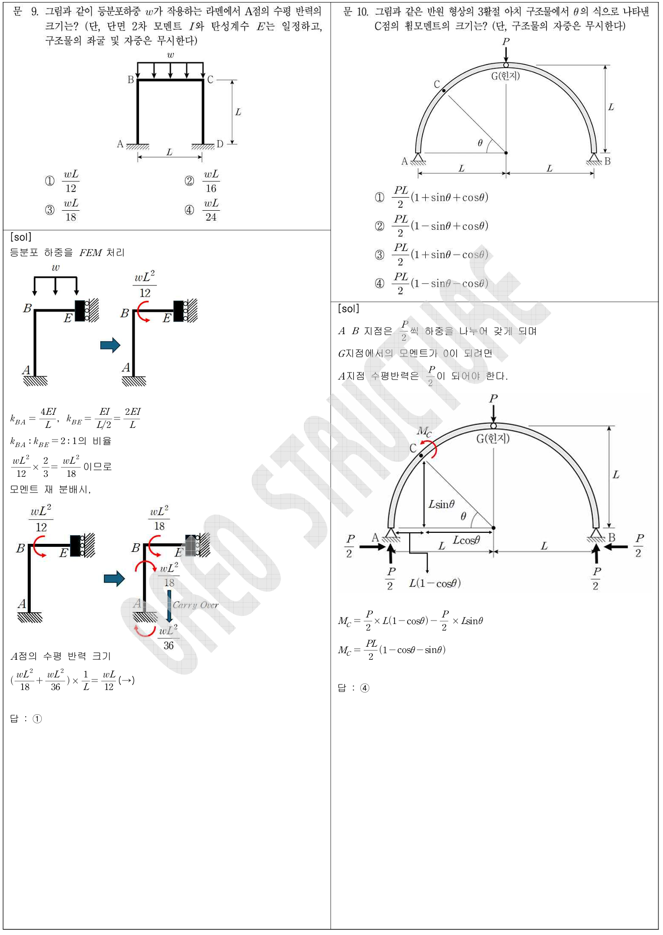 8번과 같은 구간별 축력 문제는 빈출 유형이므로 반드시 정리해 둘 필요가 있습니다. 더불어 비틀림(Torsion) 역시 축부재와 유사한 사고 흐름으로 접근할 수 있기 때문에, 8번과 유사한 형태로 언제든지 다시 출제될 수 있습니다. 10번의 아치 문항 또한 대표적인 전형 유형으로, 한 번 정리해 두면 반복적으로 활용할 수 있는 문제입니다.
