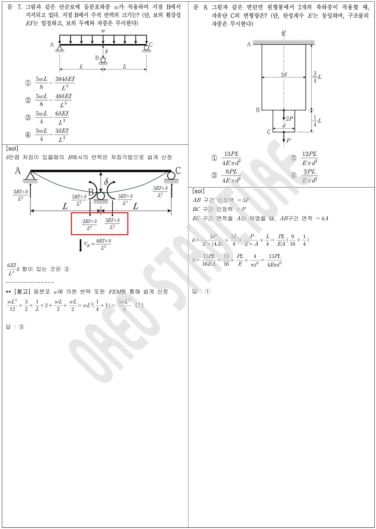 7번 문항은 지점침하에 따른 현회전각과 그에 따른 모멘트의 방향만 정확히 알고 있다면, 복잡한 계산 없이 매우 쉬운 문제로 치환할 수 있습니다. 또한 등분포하중 w가 작용하고 경간이 2L인 단순보에서 중앙점의 등가 절점하중을 구할 때 등장하는 5/4라는 계수는 19번 문항에서도 다시 등장합니다. 이는 우연이 아니라, 19번 문항을 통해 등가절점하중이 어떤 의미를 갖는지를 ‘처짐이 동일하도록 만드는 조건’에서 직접 유도해 보도록 의도된 구성이라 볼 수 있습니다. 이 두 문항을 함께 비교해 보시면 출제자의 의도를 더 명확히 이해하실 수 있을 것입니다.