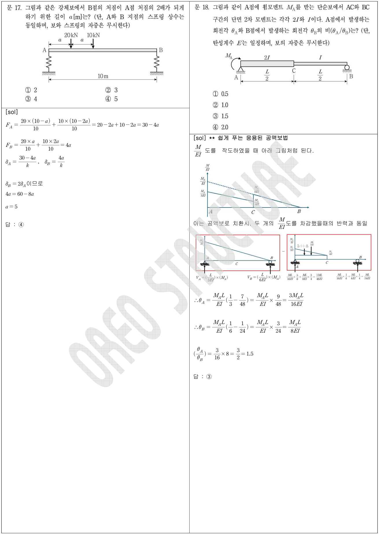 16번 문항은 국가직에서도 출제된 바 있는 유형으로, 하중과 처짐의 ‘일(work)’을 다루는 문제입니다. 원인과 결과의 관계가 아닌 경우에는 1/2 계수가 붙지 않는다는 성질을 알고 있다면 매우 쉽게 풀 수 있는 문제입니다.