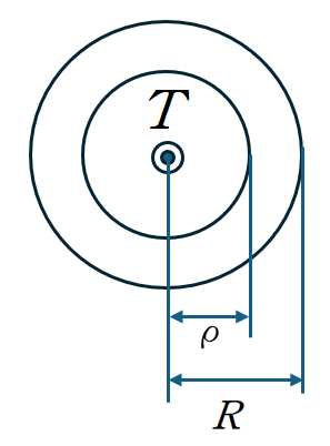 우선 위 그림과 같이 비틀림 (Torsion)을 받고 있는 반지름 R의 단면적에서 임의의 길이 ρ 만큼 떼어내어 아래와 같이 기하학적 관계를 따져보겠습니다.