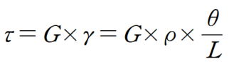 비틀림에 의한 전단변형률 γ 은 각도로서 정의 됩니다. 미소변형의 가정하에 Shaft 끝부분 에서 BB' 의 길이는 L×γ 로 표현될 수 있습니다. 이는 기하학적으로 단면내 비틀림 각도 (θ)와 임의의 길이인 ρ 를 곱한 것과 일치하게 됩니다.