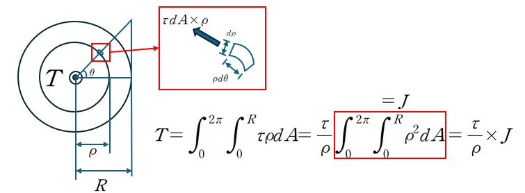 우리는 단면내 거리 ρ 만큼 떨어진 미소요소 dA가 전단응력 τ 을 갖고 있을 때 이에 대한 미소 Torque를 산정할 수 있으며