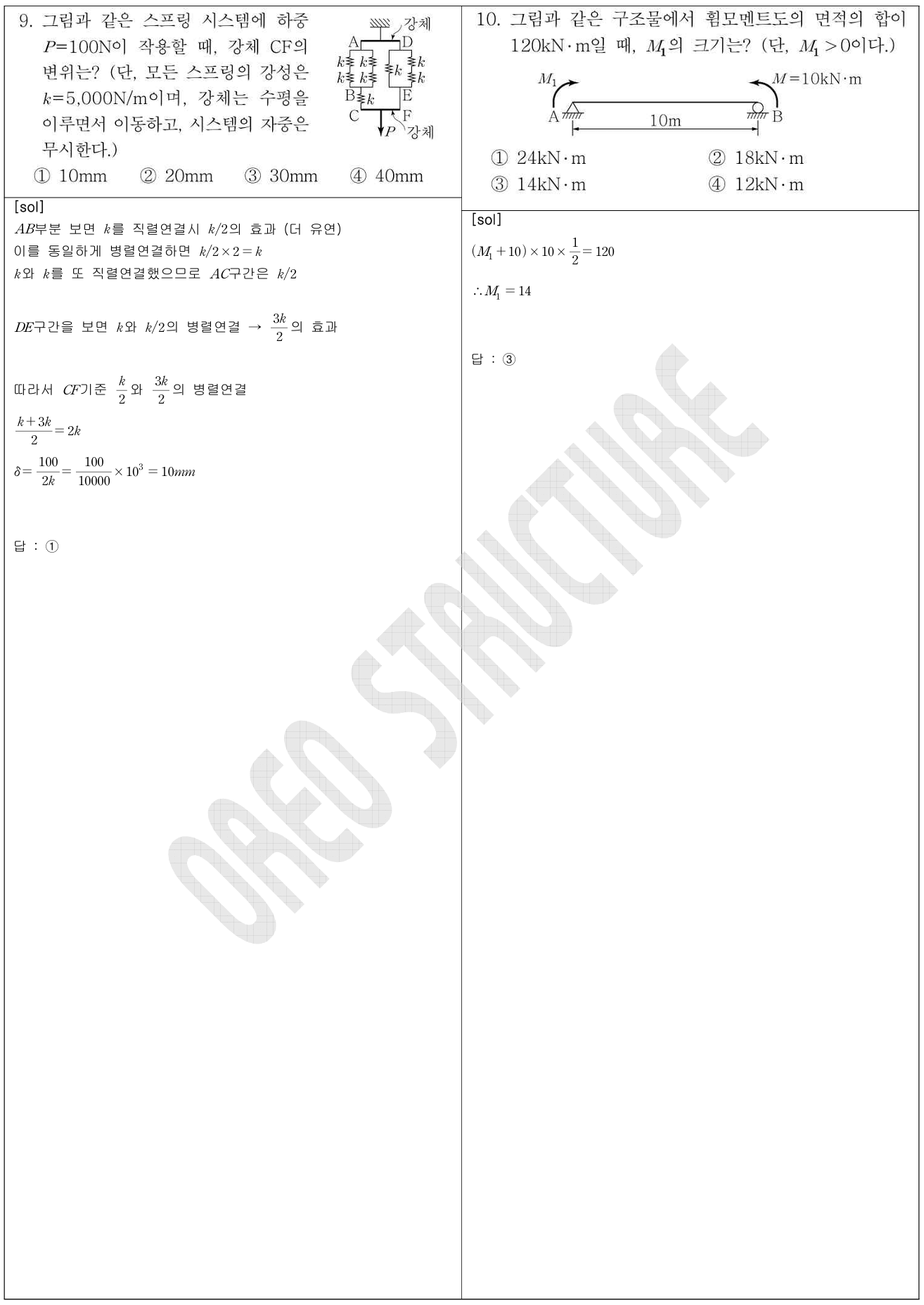 6(영향선활용 부반력 찾기), 9 (스프링 직렬 병렬 연결), 10 (모멘트 면적 - 사다리꼴 면적 구하기),