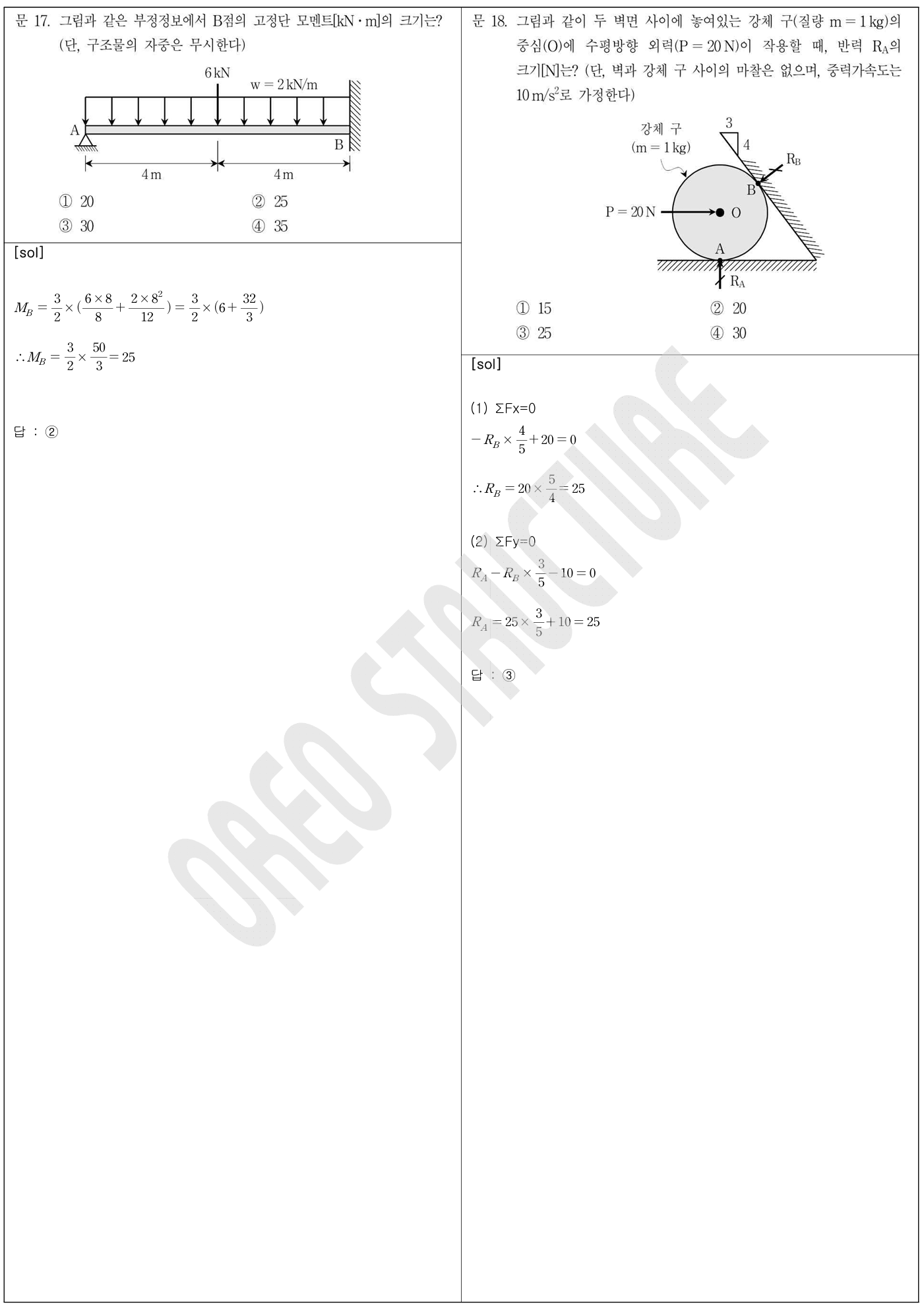 17번 (고정단 모멘트 공식 활용), 18 (정역학: 힘의 평형)