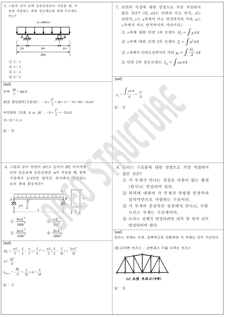 - 특정 위치 휨응력(6), 단면 성질 정의 옳고 그름(7), 도심 거리 산정(12).