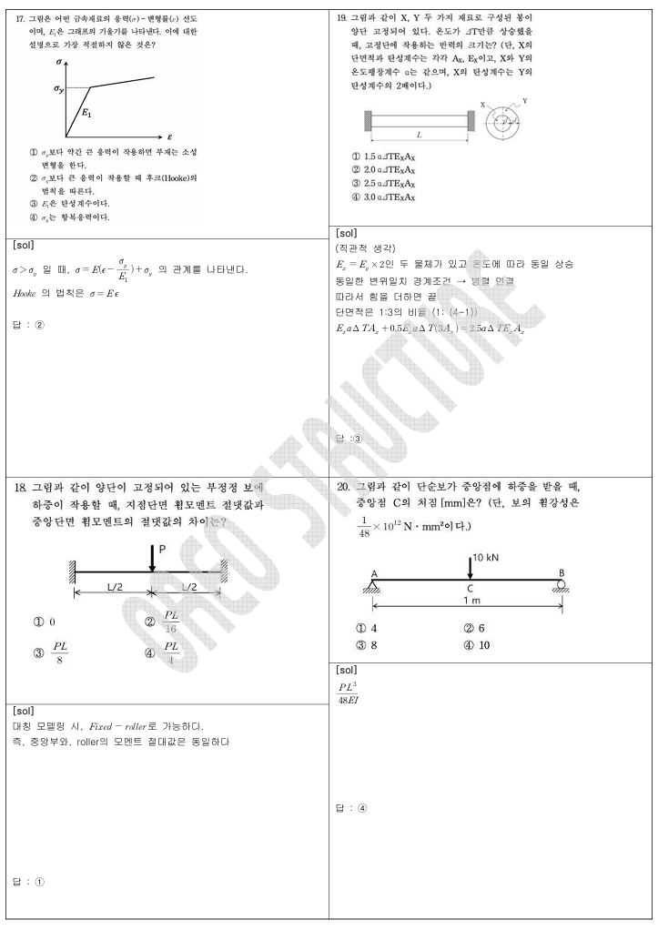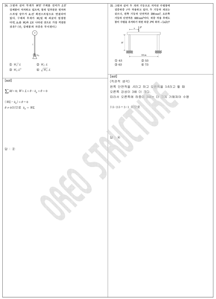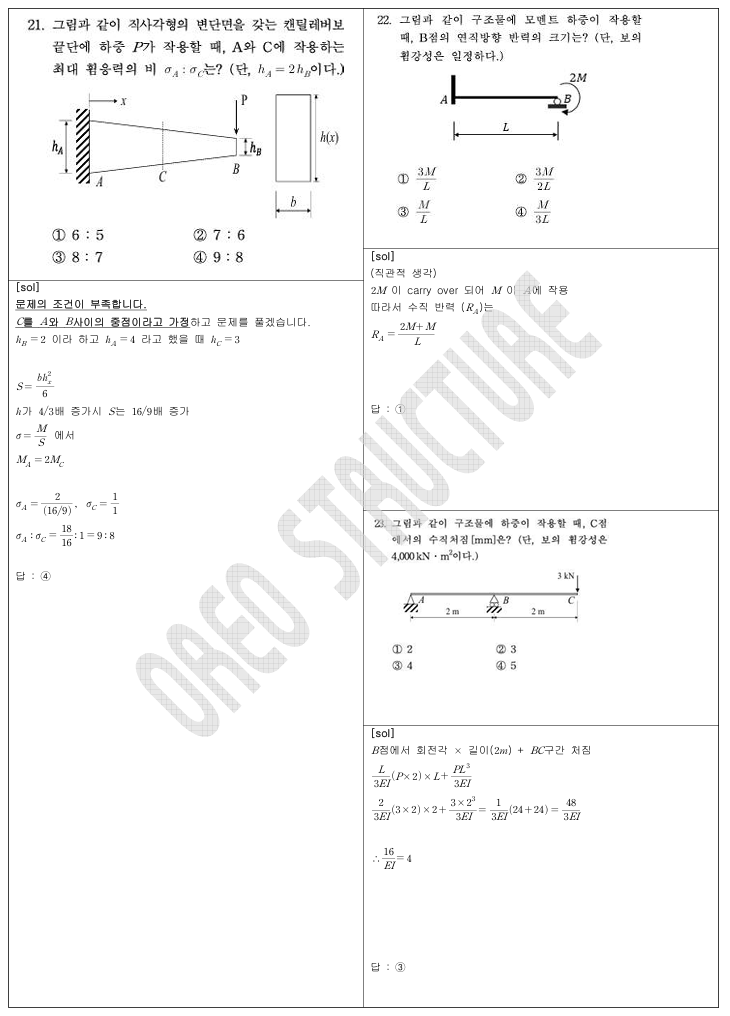 → 위치 지정된 휨응력(6), 등강도 조건과 단면 2차모멘트 비(10), 연속보 처짐(23) 등으로, 식 전개는 필요하지만 공식·관계식만 알면 충분히 해결 가능했습니다.