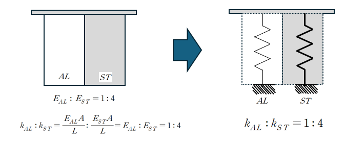 회전각이 생기지 않는다라는 의미는 강성이 높은쪽으로 하중이 이동하여 강성이 높은 스프링에 더 많은 하중이 걸린다는 의미로 이해할 수 있습니다. 알루미늄과 강재의 강성이 1:4이므로 이들 스프링에 걸리는 내력 역시 1:4가 되도록 하중이 이동해야합니다.