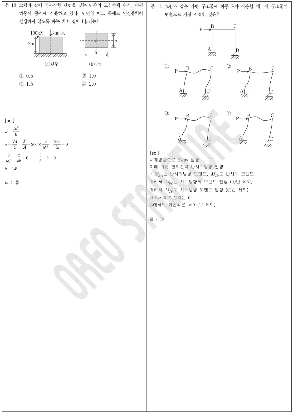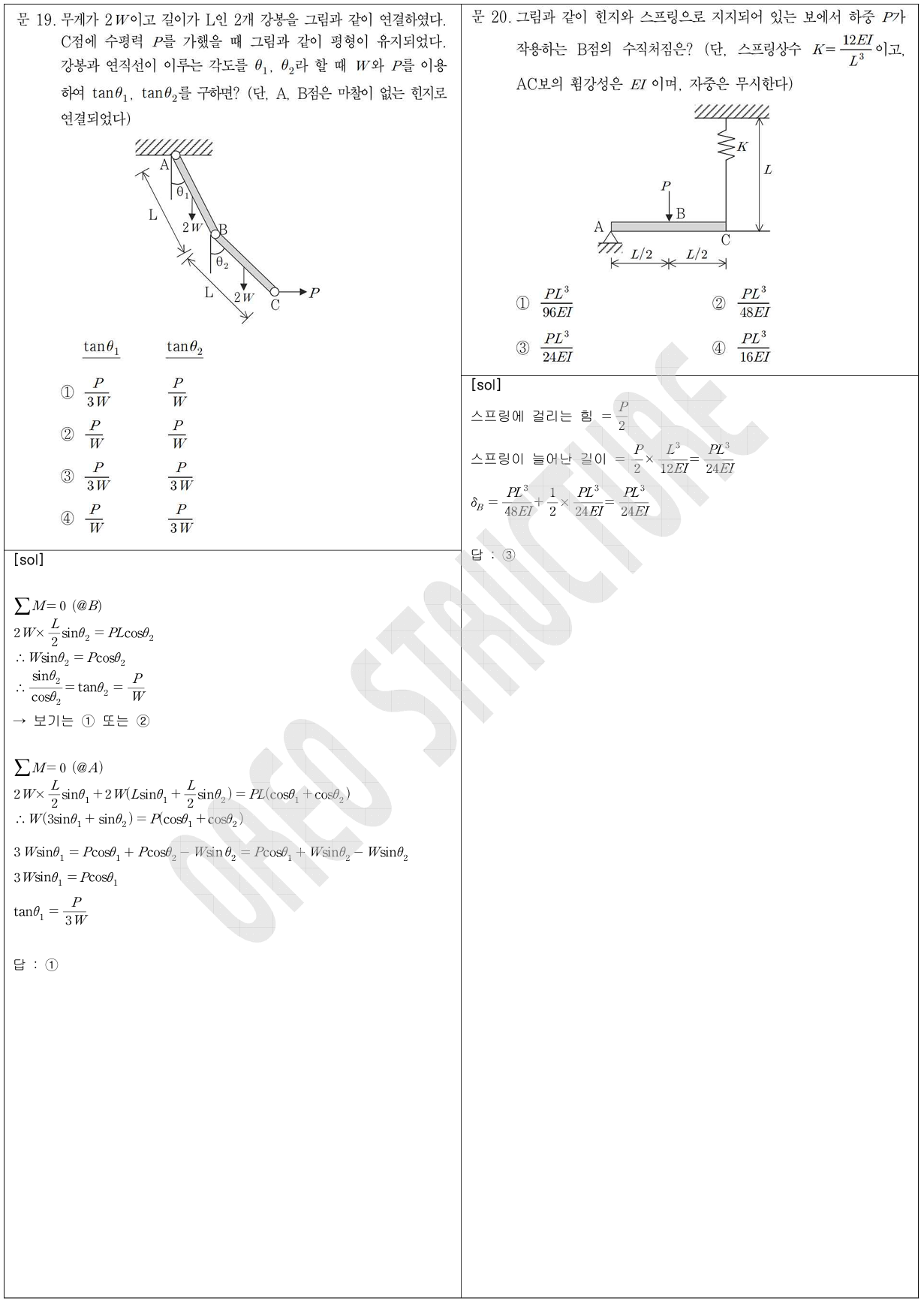 15번은 실제 하중 혹은 지점침하를 추가하는 최근 출제 경향과 비교하자면 단순 분배율만 묻는 형태로 매우 쉽게 구성되었고, 17번의 변형에너지 문제 역시 정직하게 적분을 해도 되지만 카스틸리아노 정리를 역으로 활용해 처짐을 하중에 대해 적분하는 방식으로 더 효율적으로 접근할 수 있습니다. 18번도 응력을 바로 제시해 준 덕분에 불필요한 역산 과정을 거치지 않아도 되는 배려가 있었고, 19번은 겉보기와 달리 접근 전략만 잡히면 충분히 정리 가능한 문제였습니다.