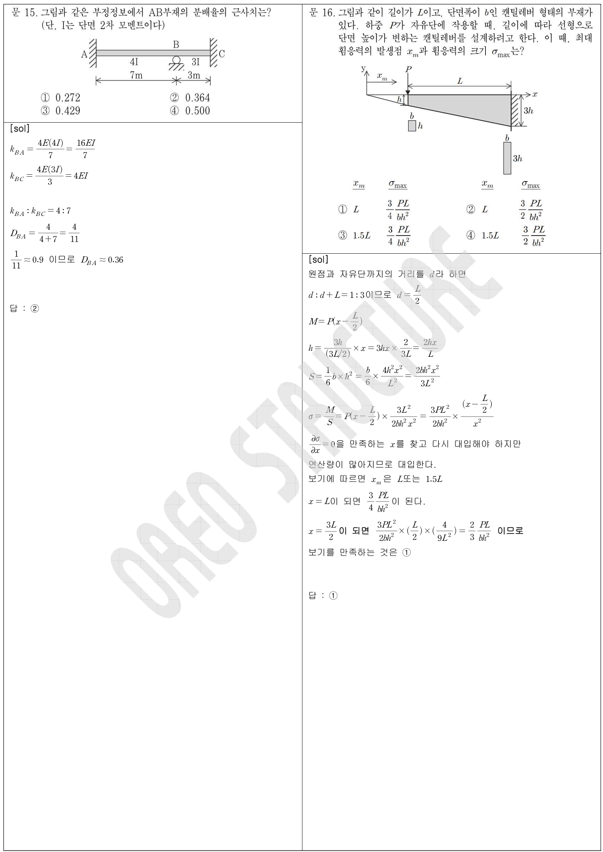 - 16 (테이퍼 보의 휨 응력) : 단면까지 미지수로 끌고 가야 하는 부담 → 보기활용으로 시간 단축