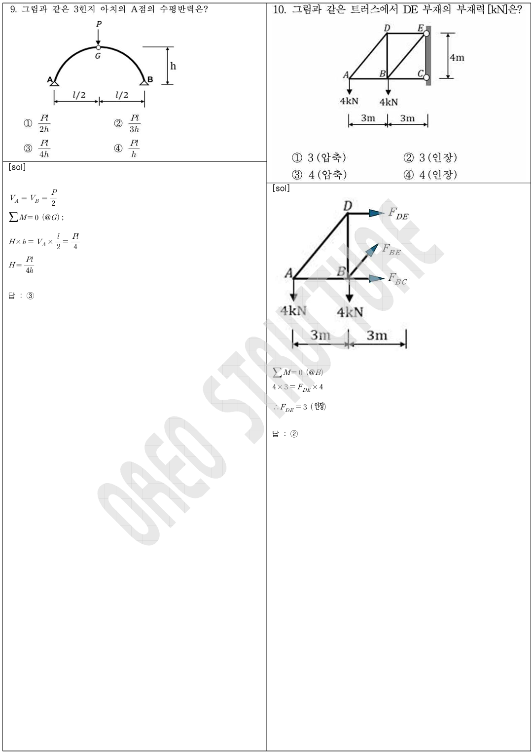 7 (정정보의 전단력 산정), 8 (정정 라멘구조물의 모멘트 산정), 9 (정정 아치의 수평반력 산정),