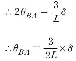 구조물이 B점의 수직처짐 (δ)이 동일하기 때문에 회전각 θ는 부재의 길이 L에 반비례하게 됩니다.