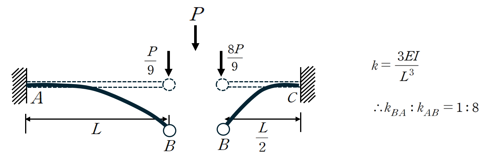 자유단에서의 처짐을 통해 강성도를 확인할 수 있으며 병렬연결시 하중은 강성도의 비율만큼 나눠갖게 됩니다.