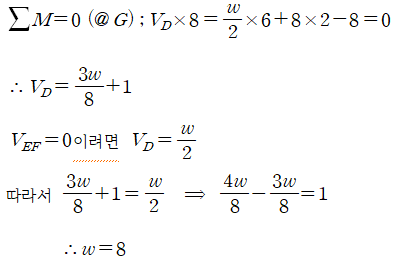 보 DG에서 모멘트 평형을 구해 D 지점의 반력을 산정 후 EF의 전단력이 0이 되려면, 산정된 값이 w/2와 동일해야 합니다.