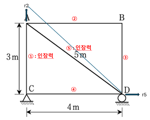 r1 만 존재 할 경우 ⑤ 번 부재의 부재에 압축 변형이 생깁니다.