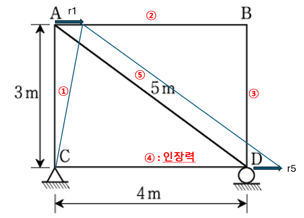 따라서 ①,④,⑤번 부재는 강체로 취급할 수 있다라는 조건에 모순이 생깁니다.