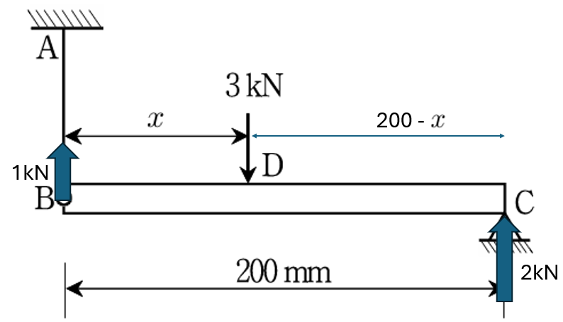 D점의 하중 3kN는 (200-x)×θ 만큼 이동하였으며