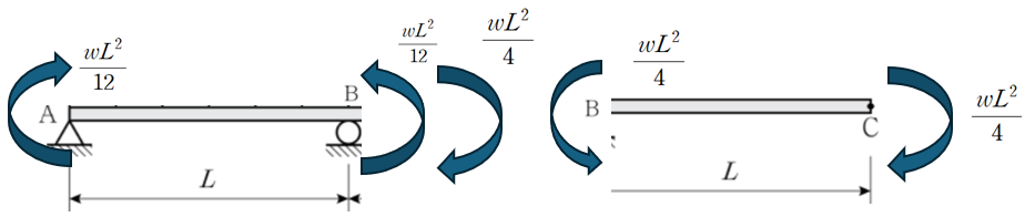 Free Body Diagram (자유물체도)를 그려보면 C점에서 작용하는 wL^2/4 하중 만큼 B 지점에 가하여 지는 것을 볼 수 있습니다.