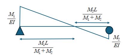 위 구조물의 경우 모멘트는 M1에서 -M2까지 선형적으로 변합니다. 이에 따른 곡률 (M/EI) 는 다음과 같이 나타낼 수 있습니다.