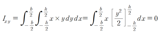 대표적으로 폭이 b 이고 높이가 h 인 직사각형 단면을 생각해볼 수 있습니다. 단면의 도심을 기준으로 상승모멘트 (Ixy)를 산정하면 다음과 같습니다.