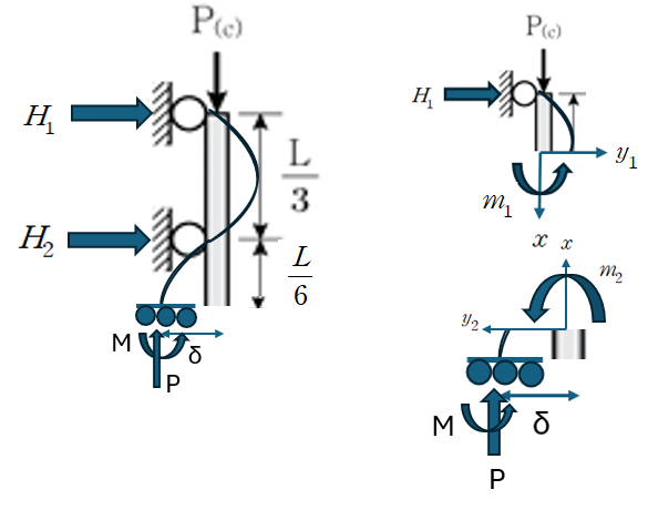 압축을 받고 있는 2개의 기둥에 대해 다음과 같이 자유물체도 (Free Body Diagram)을 그릴 수 있습니다.
