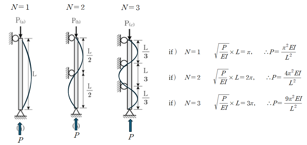 그래서 보나 기둥의 지점 조건만 알면, 그 구조물이 어떤 모드로 좌굴할지를 비교적 쉽게 예상할 수 있는 것입니다.