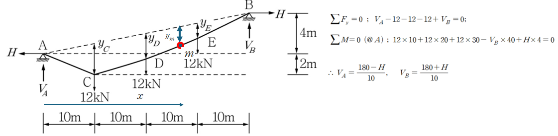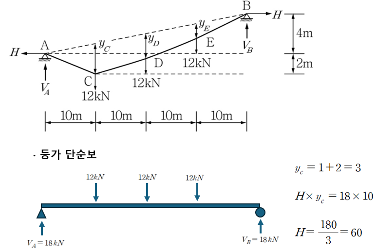- 케이블의 수평력 H 을 미지수로 두고 반력을 구해야 하고