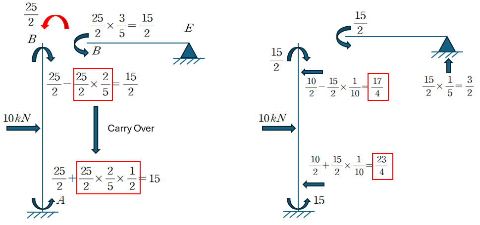 B 지점에 불균형 모멘트 25/2를 반대방향으로 가한 후 부재의 강성도 비율만큼 나눠 갖도록 합니다.