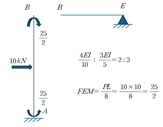 우선 부재 AB와 BE의 강성도 비율은 2:3이며 FEM은 25/2임을 알 수 있습니다.