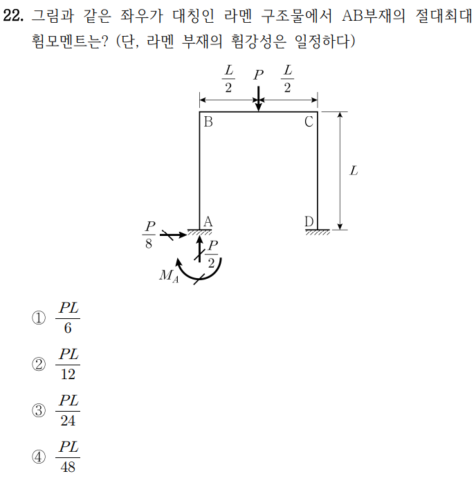 이번 문제는 2024년 국가직 7급 22번으로 출제되었던, 좌우 대칭 프레임의 절대 최대 휨모멘트를 구하는 문항입니다.