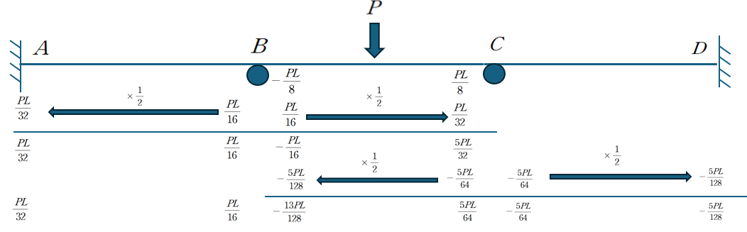 비록 대칭 조건임에도 Fixed Roller를 활용하지 않고 계산을 진행하는 과정이 다소 고통스럽게 느껴질 수는 있지만, 모멘트 분배법의 원리를 몸으로 체득하기 위해 한 번쯤은 노가다에 가까운 계산 과정을 직접 경험해 보는 것도 충분히 의미가 있습니다.