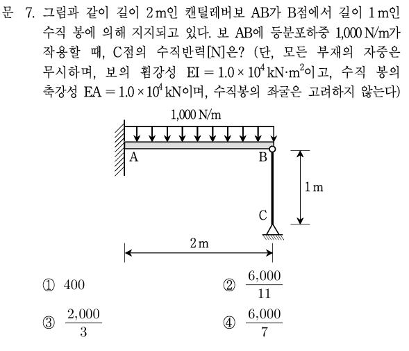 1. 개요병렬 연결 문제로의 직관최근 연달아 게시한 글들의 주제는 모두 직렬 연결과 병렬 연결의 개념을 다루고 있습니다.이제 위의 문제를 보면, 자연스럽게 “이건 병렬 연결 문제구나” 하는 느낌이 오시나요?이번 문제 역시 그 연장선상에 있습니다.점 B에서의 수직 처짐은 AB 캔틸레버 부재와 BC 축부재에 동시에 영향을 미칩니다.즉, B점의 처짐에 대해 두 부재가 함께 저항하므로이 구조는 명확히 병렬 연결(parallel connection) 형태에 해당합니다.문제 단순화 전략문제를 보다 간단히 풀기 위해,AB 부재의 등분포하중을 등가 격점하중(equivalent nodal load) 으로 치환하여 다루겠습니다.이렇게 하면 하중이 절점에 집중된 형태로 바뀌어병렬 연결 관계를 더 명확히 파악할 수 있고,계산..