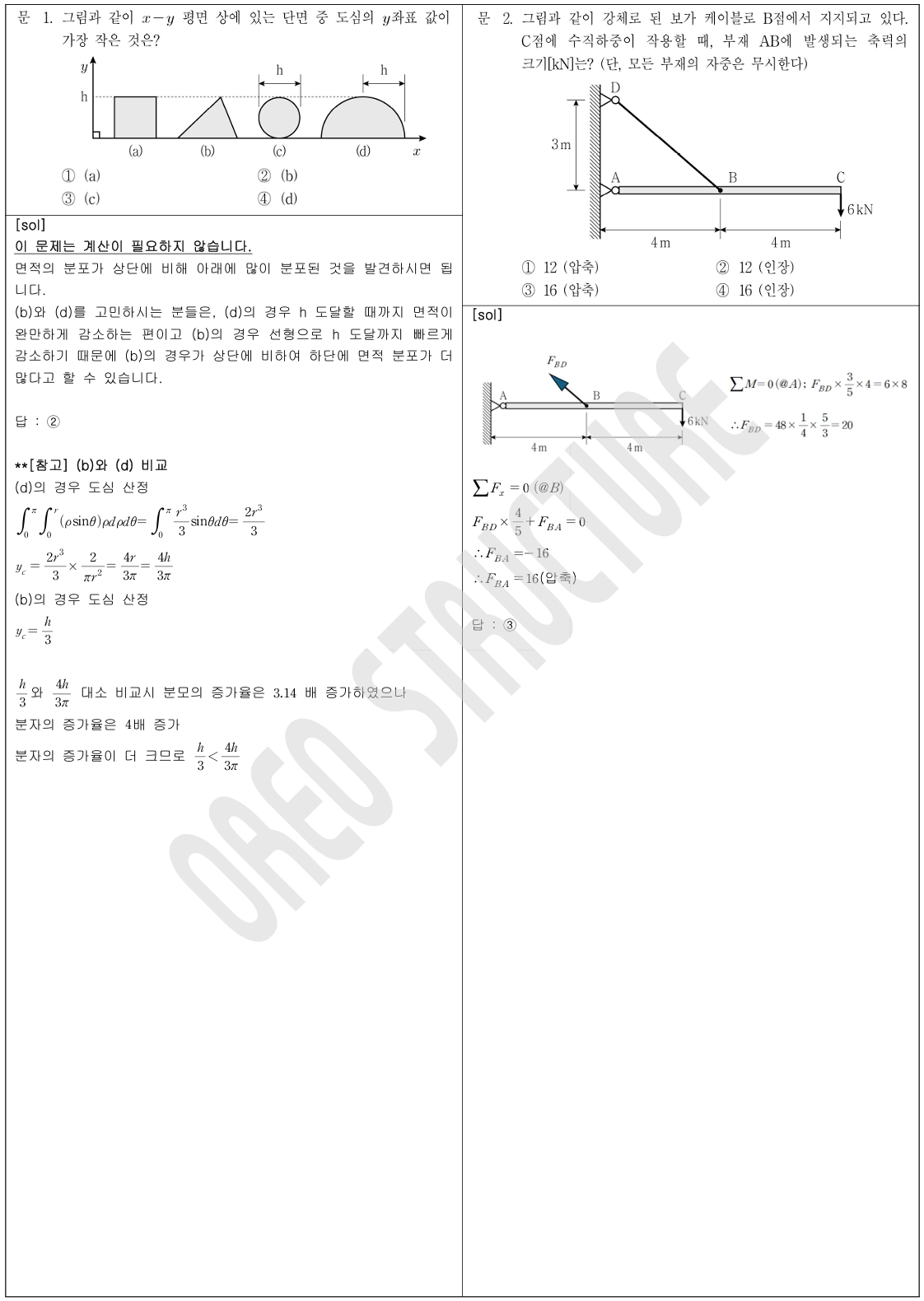 바로 풀린다” 리스트 (문제당 30초 내외)1 (단면의 도심), 2 (평형방정식으로 산정), 4 (평형방정식으로 반력 산정), 6 (트러스 단면법),7 (최대모멘트 산정), 8(정정보의 해석), 9(휨응력과 모멘트), 10(정정보의 해석), 11(단면의 도심)13(평행축 정리), 16 (정정 트러스의 해석), 17(단면의 도심), 18 (정정 축부재의 해석), 19 (기본 좌굴)“시간이 걸리지만 풀만하다” 혹은 낯선 유형 리스트[Newbie 기준] 3 (부정정 보의 해석) : 기본 문제, 부정정에 대한 거부감이 있는 사람들은 넘겼을 것[Newbie 기준] 5 (부정정 보의 해석) : 변위법으로 부정정 해석, 부정정에 대한 거부감이 있는 사람들은 넘겼을 것12 (축부재의 부재 변위와 Global 변위) :..