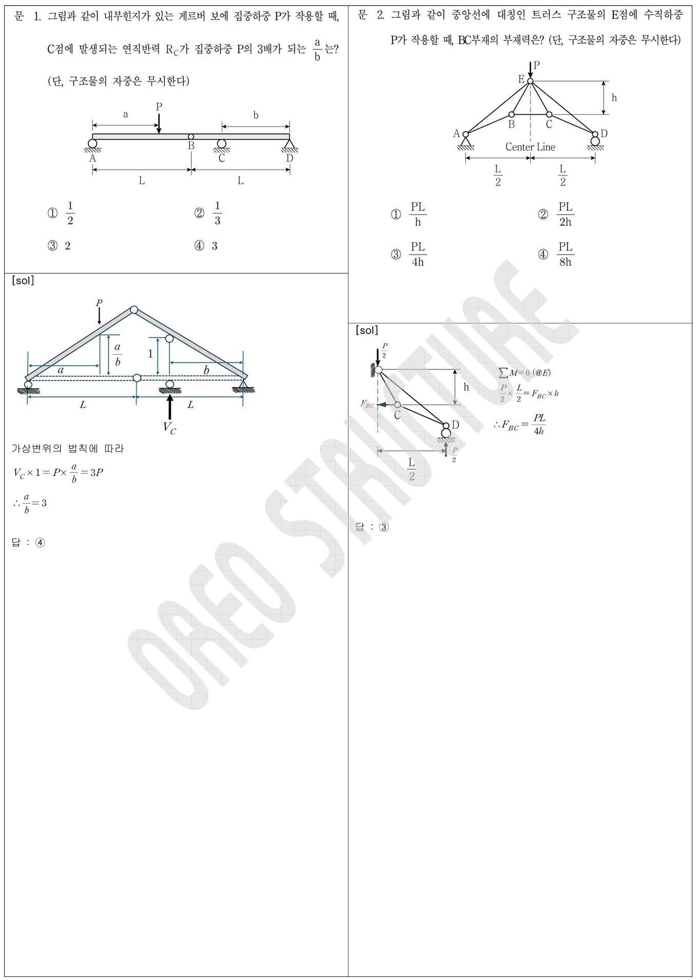 바로 풀린다” 리스트 (문제당 30초 내외)1 (가상변위의 법칙), 2 (트러스 단면법), 3(단면 1차 모멘트, 도심 유형)4 (평형방정식), 6 (정정구조물 -평형방정식), 7 (응력 invariant 활용),8 (처짐 - 중첩법), 11 (정정구조물의 BMD, SFD), 12(응력-변형률-포아송의 비)13(구 압력용기 문제), 14 (영향선 활용), 15 (소성 단면계수 활용), 17번 (모어원과 탄성계수), 18 (좌굴-단면과 좌굴유효길이)20 (고정단 모멘트 산정)“시간이 걸리지만 풀만하다” 리스트5 (가상 변위의 법칙 - 2 자유도로 인한 연립방정식 풀이)10 (부정정 구조물의 해석 : 유연도법 과 공액보법 활용으로 쉽게 풀이 가능)16 (온도에 의한 등가절점하중 활용시 빠르게 풀림)19 (변..