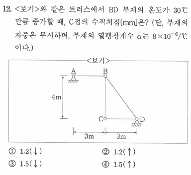 2024년 서울시 7급 응용역학 12번 (매우 쉬운 풀이) 트러스 온도변화 문제 — 단위하중법 말고 더 빠른 풀이 이번 문제는 트러스 부재에 온도 변화가 생겼을 때, 특정 절점의 처짐을 구하는 전형적인 유형입니다.시중 문제집이나 인터넷 풀이들을 보면 대부분 단위하중법을 사용합니다.하지만 사실 이 문제는 단위하중법 없이도, 훨씬 쉽고 직관적으로 풀 수 있는 방법이 있습니다.문제다음과 같은 트러스에서 BD 부재의 온도가 30℃ 증가할 때, C점의 수직 처짐 [mm]은 얼마인가?(부재의 자중 무시, 열팽창계수 ($\alpha = 8 \times 10^{-6}/℃$))풀이 아이디어이 문제의 본질은👉 BD 부재의 온도변화로 인한 변형(Local DOF)이, C점의 수직 처짐(Global DOF)으로 어떻게 나타나는가?라는 해석입니다.정정 구조물에서는 온도변화.. 2024년 7급 9급 시험/2024년 7급 공무원 서울시 2025.10.01