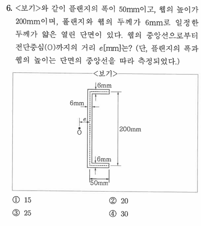 2024년 서울시 7급 응용역학 6번 (전단 중심 쉽게 풀자!) [응용역학 풀이] 얇은 두께 단면의 전단중심 문제 (전형적 C형 단면)이번에는 얇은 두께 단면(open section)의 전단중심(shear center)을 구하는 전형적인 문제를 풀어보겠습니다.📌 문제 조건플랜지 폭: b = 50 mm웨브 높이: h = 200 mm두께: t = 6 mm구할 것: 웨브 중앙선으로부터 전단중심까지의 거리 e1. 단면 2차 모멘트 계산단면의 2차 모멘트 $I$는 웹과 플랜지를 고려하여 다음과 같이 구합니다.$$I = \frac{1}{12} t h^3 + (b \cdot t)\left(\frac{h}{2}\right)^2 \cdot 2$$수치 대입:$$I = \frac{1}{12}\cdot 6 \cdot 200^3 + (50 \cdot 6)\cdot (100)^2 \cdot.. 2024년 7급 9급 시험/2024년 7급 공무원 서울시 2025.10.02