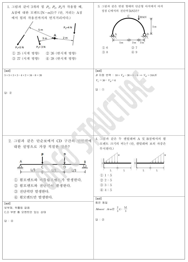 “바로 풀린다” 리스트 (문제당 30초 내외)1, 2, 3, 6 (부재의 부피 산정 매우 간단), 7(보기 활용), 9 (출제자의 배려), 10 (보기 활용)11 (변위일치 공식을 알려줌), 13(전형적인 유형), 14 (가상일의 원리, 부재수도 2개만)16 (자주 쓰이는 Stiffness 암기시 매우 수월), 17 (출제자의 배려), 18 (매우 간단한 단면법)19 (스프링의 병렬연결)“시간이 걸리지만 풀만하다” 리스트4 (최대 모멘트 위치 파악), 8, 12 (물성치가 많으면 하나를 기준으로 몇배수인지 보자),15 (변형률 값이 기하학적으로 들어오지 않아 불가피하게 공식 활용)20 (에너지 법_ 충격하중의 원리)“나머지 풀고 되돌아 오자” 리스트5 (영부재가 많아서 실수할 가능성 있다)1. 총평이번 ..