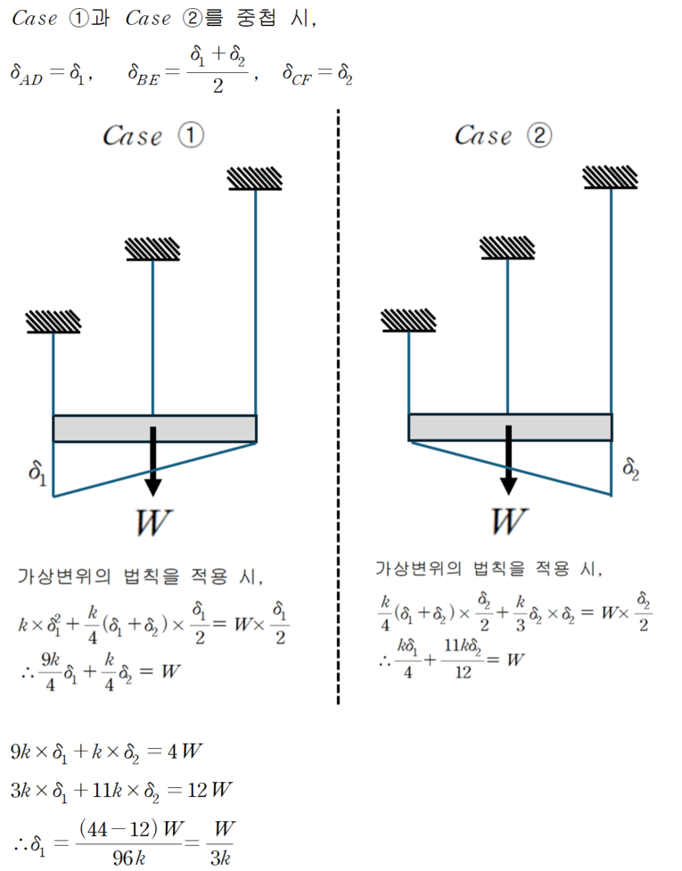 응력법의 경우, 부정정력을 도입하더라도 결국 힘의 평형방정식을 통해 하나의 미지수로 정리해야 하는 부담이 있습니다. 중간 정리 과정에서 실수가 발생하면 전체 풀이가 흔들릴 수 있습니다.