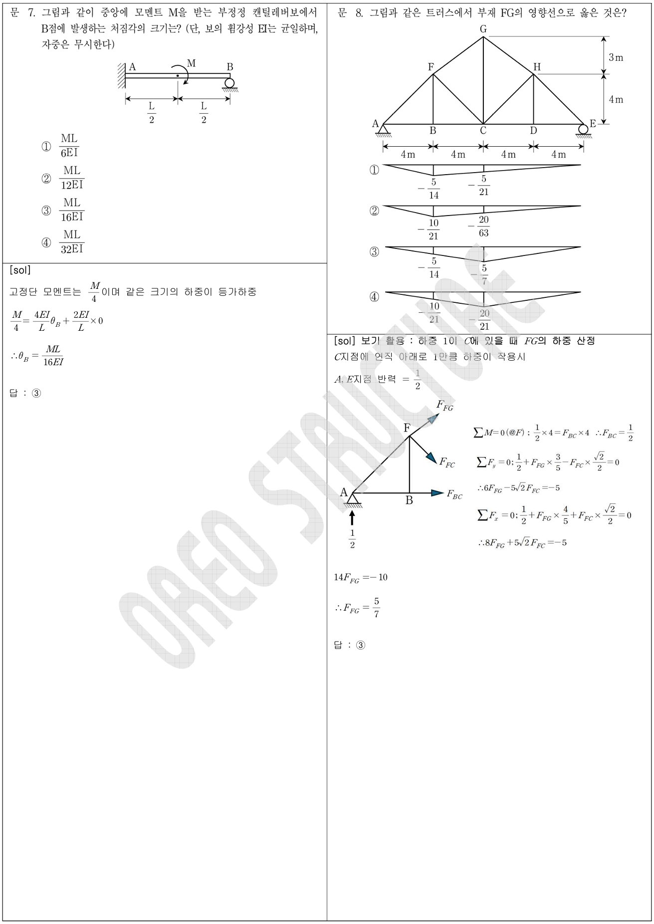 1번 문제는 구조물 내 최대 휨모멘트를 묻는 문제로 처음에는 다소 당황스러울 수 있으나, 실제로는 필요한 구간의 모멘트를 구하기 위해 수평반력만 산정하면 충분하며 이는 가상변위의 법칙을 활용하면 연립방정식 없이도 비교적 쉽게 구할 수 있습니다. 3번 문제는 변형에너지 계산과 관련된 문제로, 각 구간의 모멘트를 일일이 구해 제곱 후 손적분을 수행하기보다는 카스틸리아노 정리를 역으로 활용하여 처짐을 하중에 대해 적분하는 방식으로 접근하는 것이 훨씬 효율적이며, 이때 P/2에 의한 처짐을 적분할 경우 d(P/2)로 적분되므로 계수 1/2를 반드시 곱해주어야 한다는 점을 주의해야 합니다. 또한 조합하중 문제도 출제되었으나 공무원 시험의 특성상 손계산으로 시간 내 풀이가 가능해야 하기 때문에 두 개 이상의 하중을 복합적으로 고려하는 형태보다는 서로 다른 두 하중을 조합하는 유형이 주로 출제되며, 출제자들은 직렬과 병렬 연결 개념을 동시에 묻는 문제를 선호하는 경향이 있습니다. 이러한 유형은 개념을 명확히 이해하고 적절한 스킬을 활용하는 수험생에게는 비교적 쉽게 풀리지만 그렇지 않은 경우에는 매우 복잡하게 느껴질 수 있습니다. 이번 회차를 어렵게 느낀 수험생들은 초반에 시간이 많이 소요될 것 같은 문제를 별다른 풀이 장치 없이 평형방정식만으로 정면 돌파하려 하면서 시간과 체력을 소모했고, 그 결과 뒤이어 나오는 문제들까지 부담이 커지면서 전체적인 체감 난이도가 상승했을 가능성이 큽니다. 따라서 시험 초반이라 하더라도 어렵다고 판단되는 문제는 과감히 넘기는 전략이 필요하며, 사람마다 기준은 다를 수 있지만 자신만의 문제 선별 기준을 만들어 반복적으로 훈련하는 것이 매우 중요합니다.