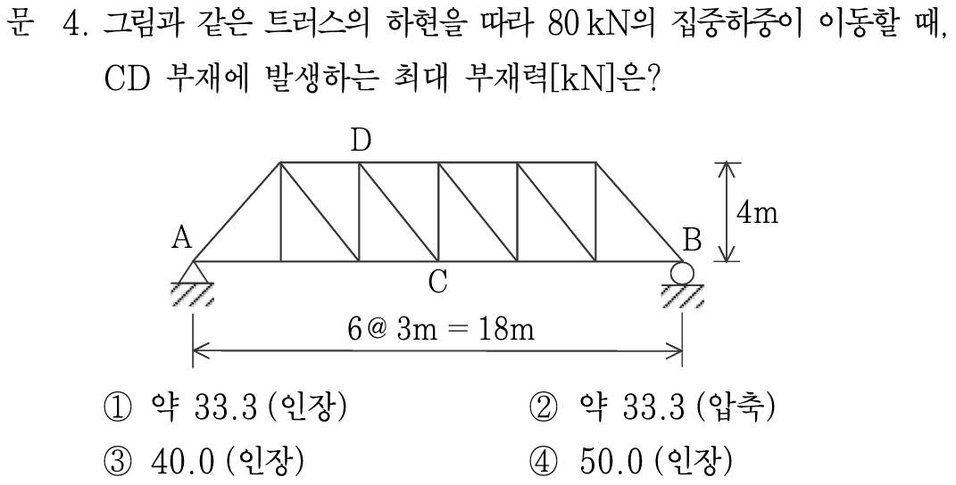 따라서 문제에서 요구하는 80kN의 이동하중에 따른 부재 CD의 최대 부재력은 80× 5/8 = 50 kN 이 됩니다.