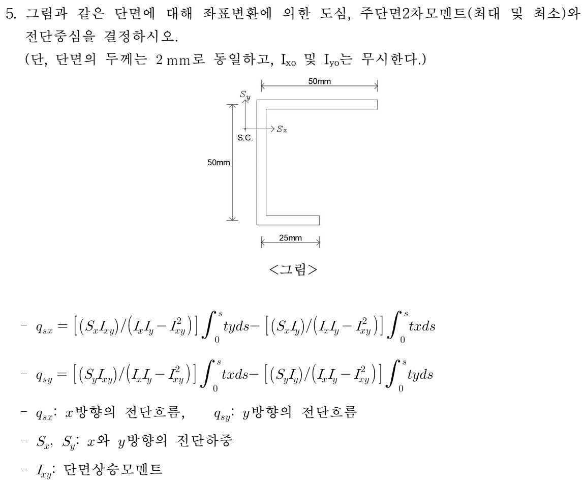2009년 5급 구조역학 문제의 경우, 다소 까다롭게도 비대칭 단면에서의 전단흐름 공식을 따로 제시하지 않았습니다.